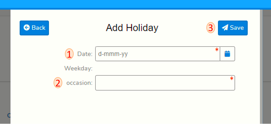 1. After adding new holidays, Column holiday and Restricted Holiday will be cross. To declare it's  a holiday or Restricted holiday select either one based on location. In case if that occasion neither a Holiday or Restricted Holiday cross both of them.