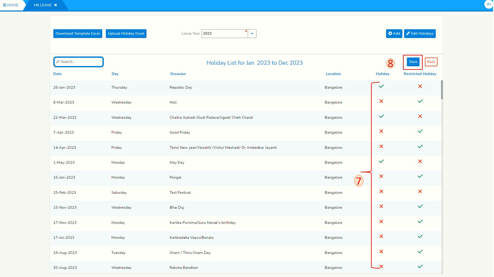 - After adding new holidays, Column holiday and Restricted Holiday will be cross. To declare it's a holiday or Restricted holiday select either one based on location. In case if that occasion neither a Holiday or Restricted Holiday cross both of them.