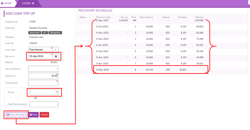 - In the screen above, you should enter only the full settlement payment date, known as the 'Top-up on' date, and set the tenure to 1. This signifies that the employee has completed the balance full settlement through payroll for this month, on the selected date. Then, click on 'Show Schedules,' and the screen will display the recovery schedule as shown below.