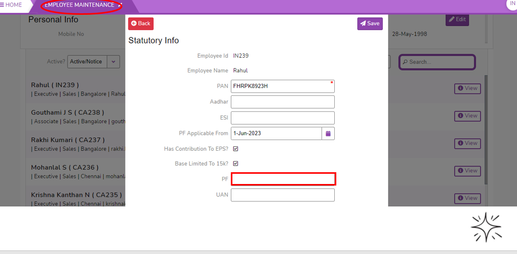 - Open Employee Maintenance menu. Here you can see all the Employee details.
