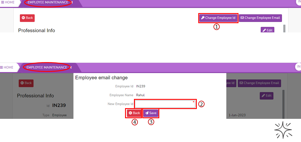 - Click on Change Employee Id if you want to change Employee Id. Enter new employee id and click on Save button for save or click on Back button to return.